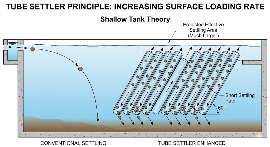 A Kecondongan 60 darjah adalah optimum untuk pemendapan kerana ia cukup curam untuk pepejal termendap menggelongsor ke bawah dinding tiub melalui graviti (pembersihan diri) sambil kekal cukup cetek untuk memaksimumkan kawasan mendap mendatar yang berkesan.