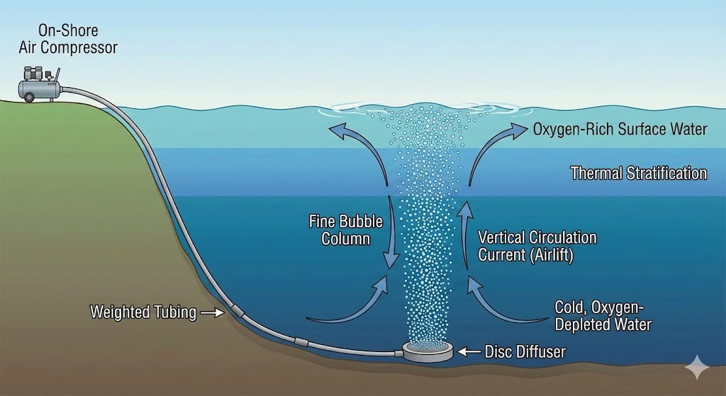 Cara ia berfungsi: Apabila gelembung meningkat, ia mencipta kesan "mengangkat" yang dipanggil pengangkat udara. Ini menarik air yang kehabisan oksigen dari bawah ke permukaan untuk berinteraksi dengan atmosfera, dengan berkesan memecahkannya stratifikasi haba dan mengoksigenkan keseluruhan lajur air.
